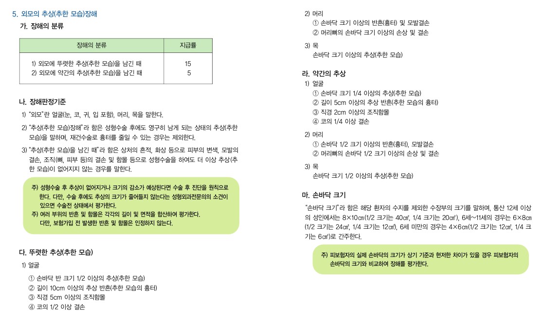 또한 얼굴에 상해로 인한 흉터가 길이 5cm이상 남은 경우까지도 장해의 분류로 보고있습니다.