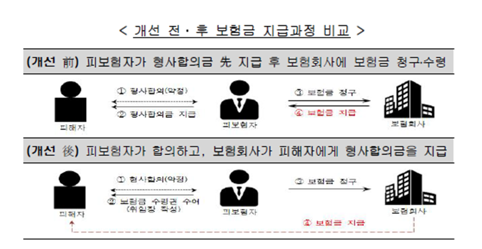 17년 3월 1일부로 보험사가 피해자에게 합의금을 직접 지급하도록 지급방식 개선되었습니다.