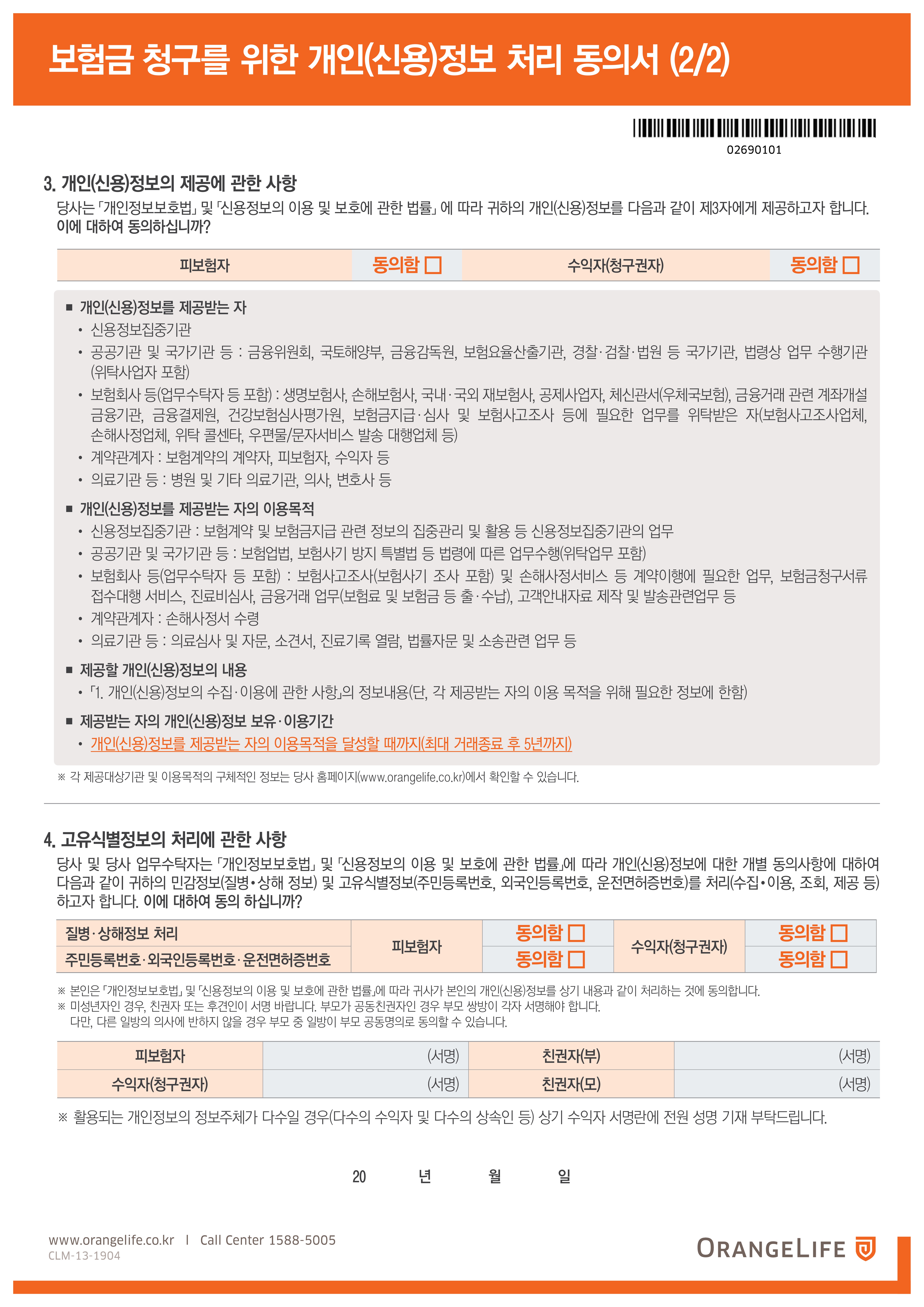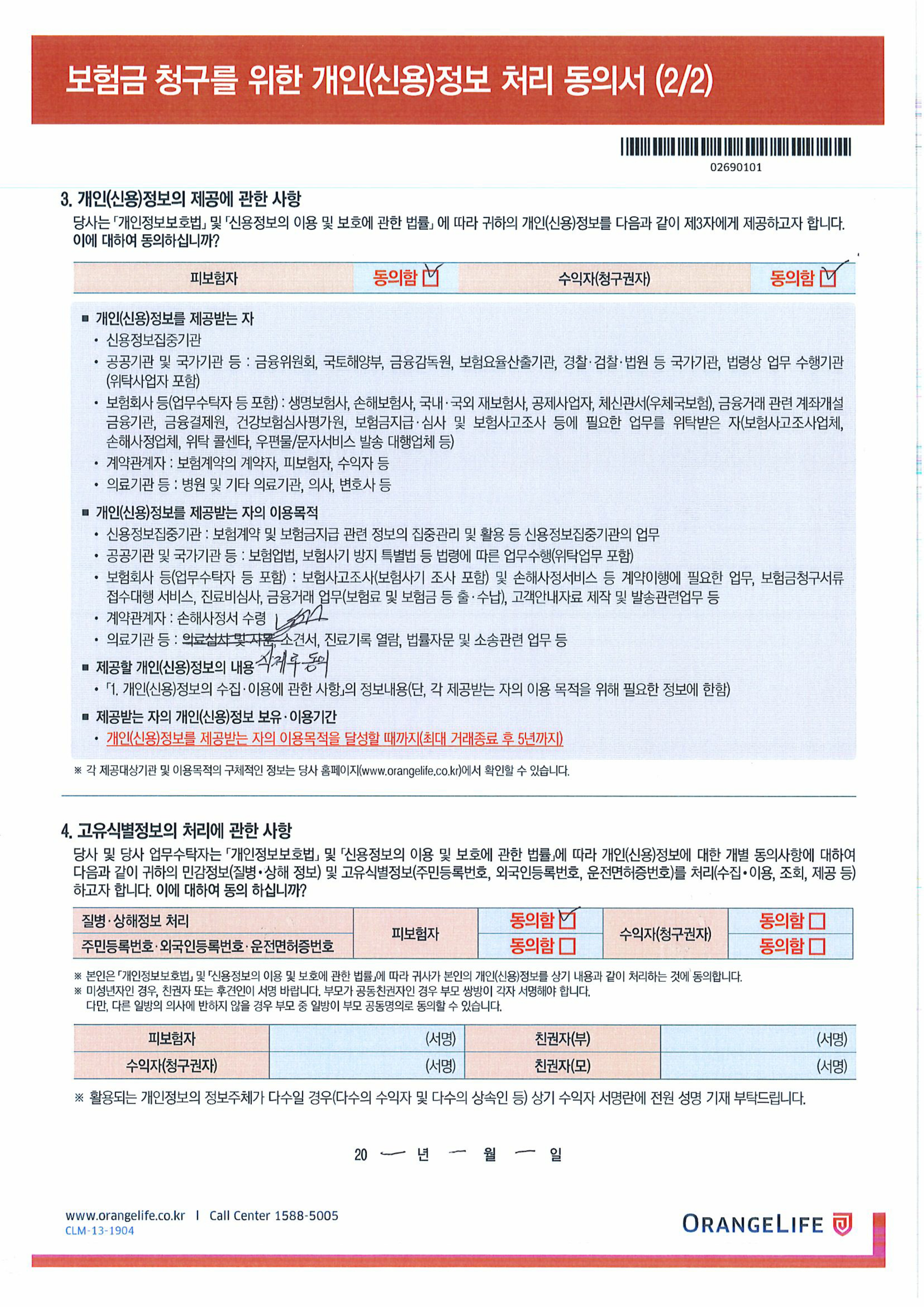 앞서 말씀드렸던 서면으로 된 보험금 청구서 안에는 보험금 청구서외에도 개인정보활용동의 서류가 포함되어 있습니다. 보험금 청구서는 양식대로. 작성하고, 이 개인정보동의서에다 보험사를 향해 일종의 주장을 하면 됩니다.