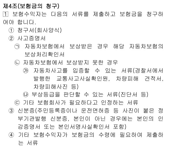 - 자동차사고를 입증할 수 있는 서류 (경찰서에서 발행한 교통사고사실확인원, 차량피해견적서, 차량피해사진 등)와 함께 부상등급을 판단할 수 있는 진단서와 같은 서류 두가지가 동시에 필요합니다.