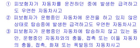 2. 피보험자가 운행중인 자동차에 운전을 하고 있지 않은 상태로 탑승중에 발생한 급격하고도 우연한 자동차사고