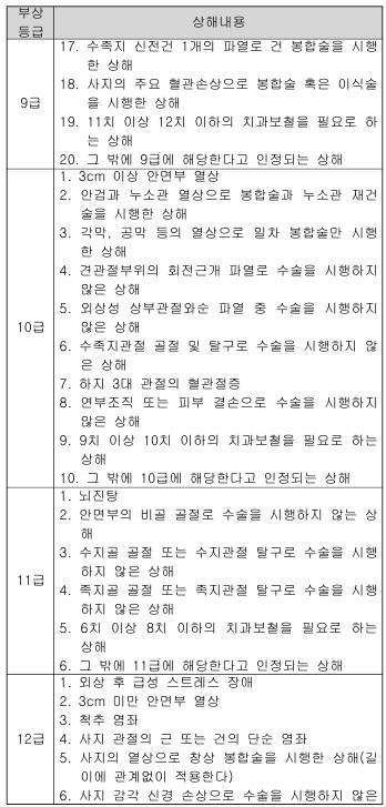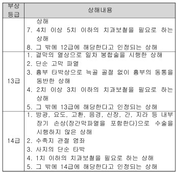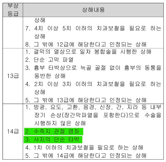 14급에는 비교적 가벼운 교통사고로도 받을 수 있는 '사지의 단순 타박' 이 포함되어 있죠.