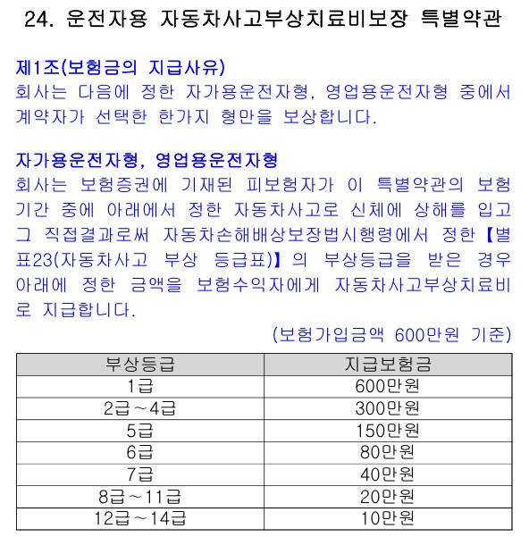 자동차보험에서 정한 상해등급에 따라 분류를 하죠. 자동차부상치료비보장 특약의 약관을 살펴보면,