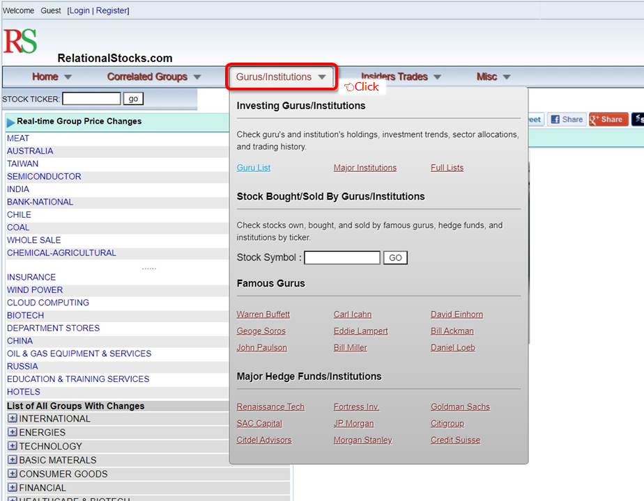 1. 메인화면의 메뉴중, Gurus/Institutions 를 클릭합니다.