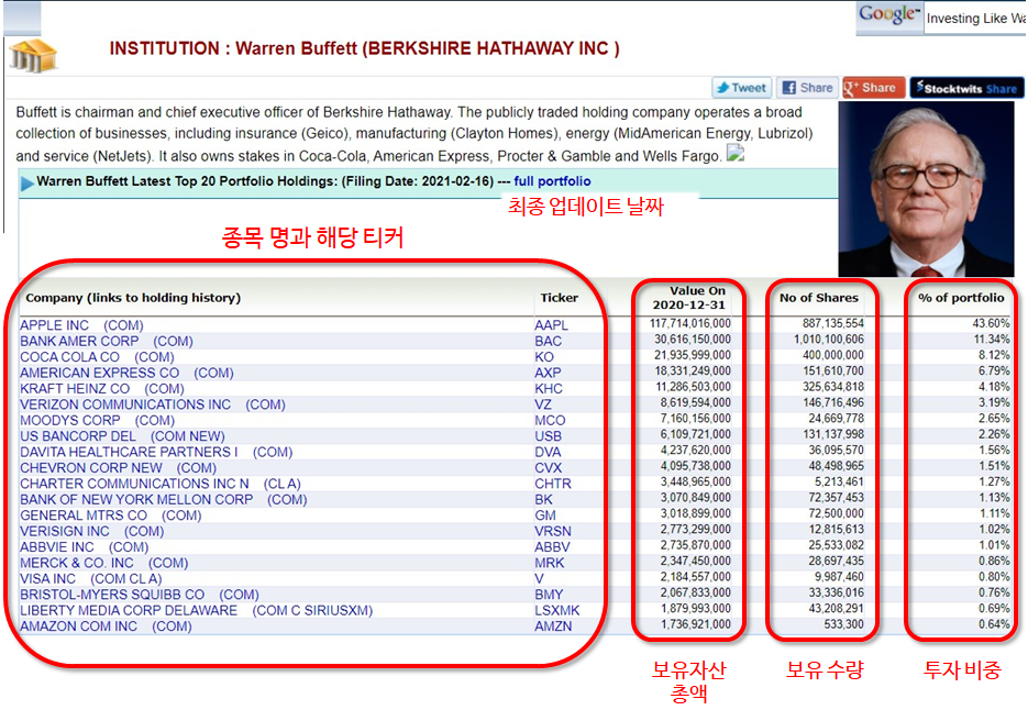 버크셔 해서웨이의 CEO, 오마하의 현인이라고 불리며 100년뒤 교과서에 등재될 것으로 평가받는 투자의 거장중의 거장 워렌버핏 포트폴리오입니다.🔝