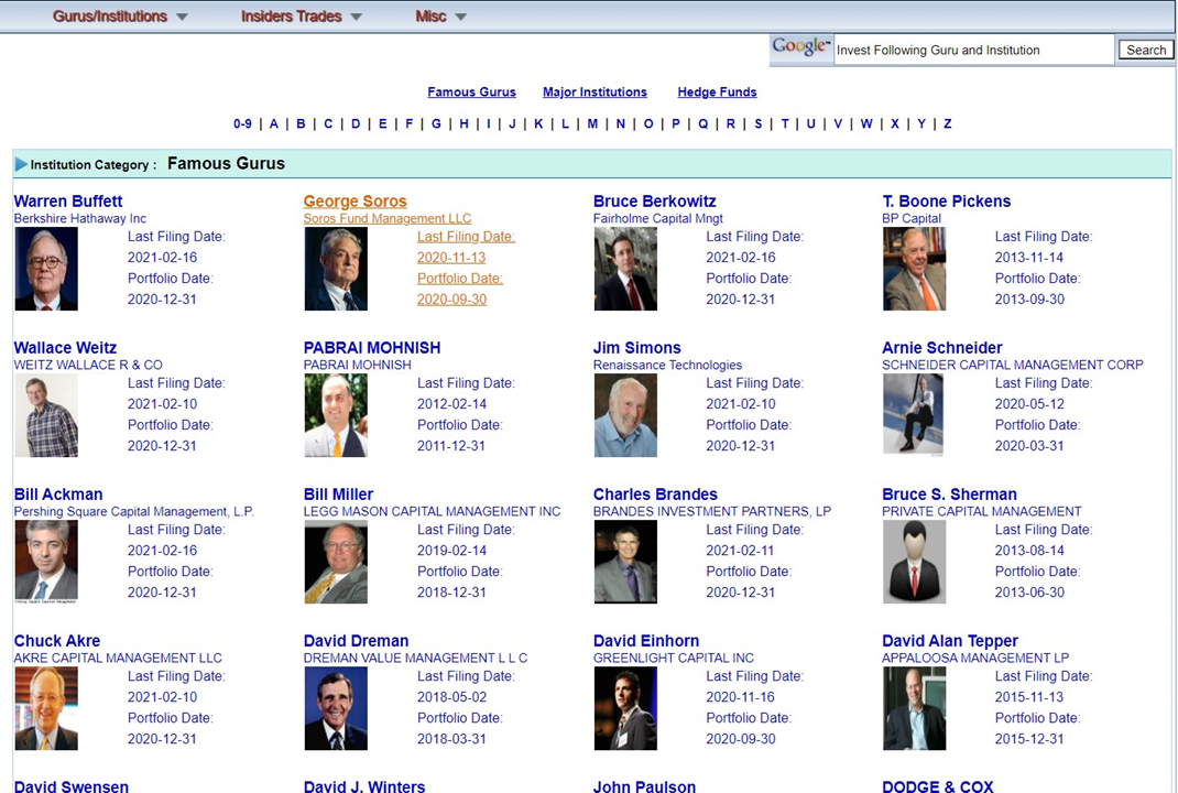 너무 많아서 뭐부터 봐야할지 모르겠다면, Famous Gurus, Majoj Institutions 를 클릭해서 유명한 투자자, 메이저 투자기관을 먼저 살펴봐도 무방합니다.