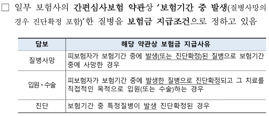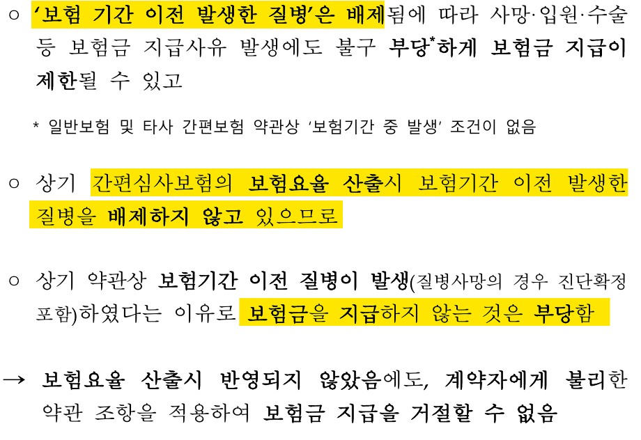 간편심사보험을 가입했지만 약관상 보험가입 이전에 발생한 질병은 보상받지 못한다는 불합리한 제도의 개선내용🆕