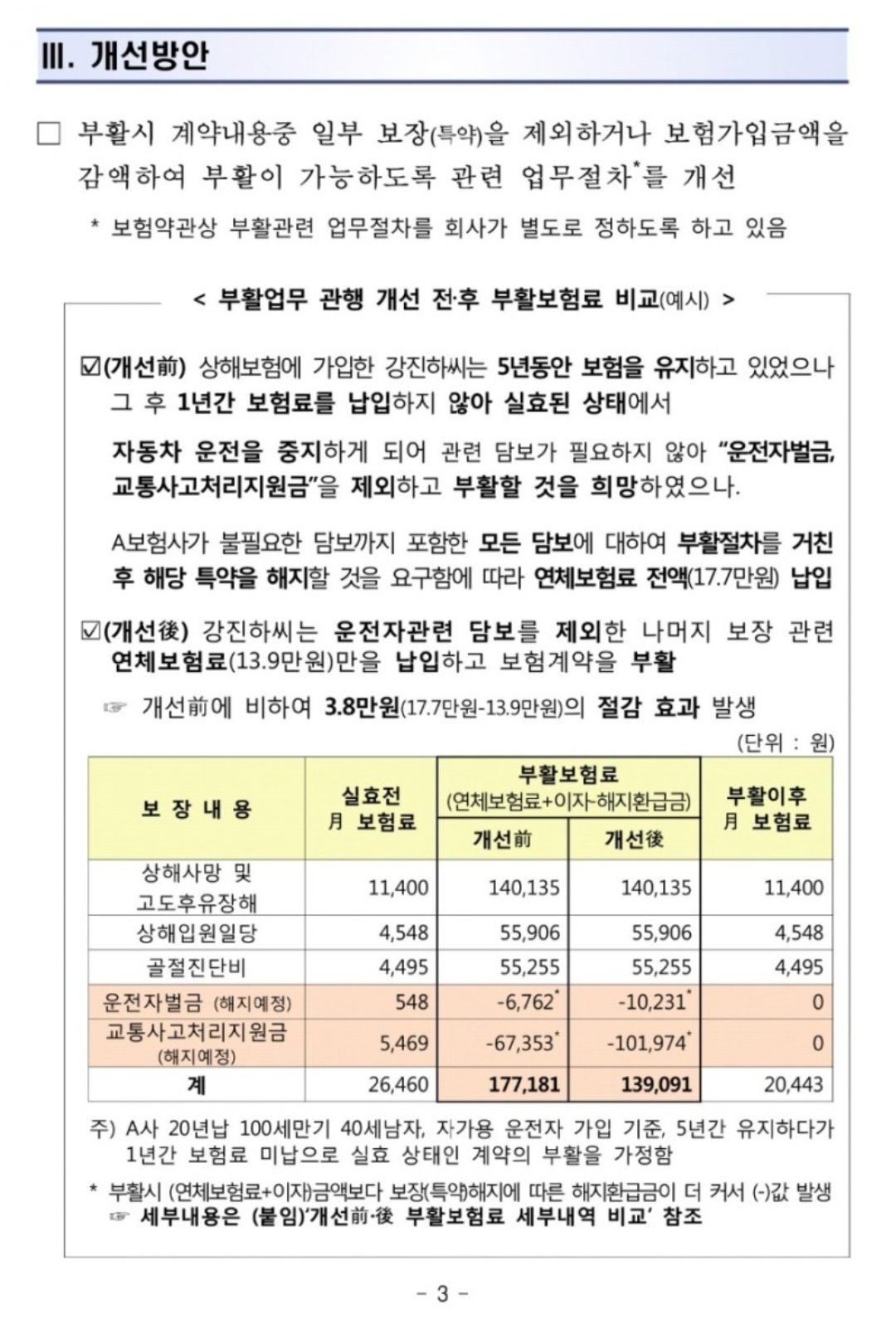 골자는 "보험계약 부활시 일부 보장내용만 선택하여 부활하거나 보험가입금액을 감액하여 부활할 수 있도록 개선"입니다