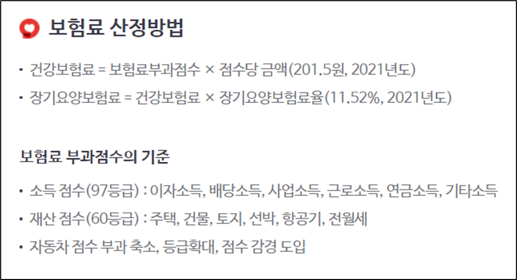 - 건강보험료 = 보험료부과점수 x 점수당 금액 (201.5원, 2021년도, 2022년 점수당 205.3원 예정)