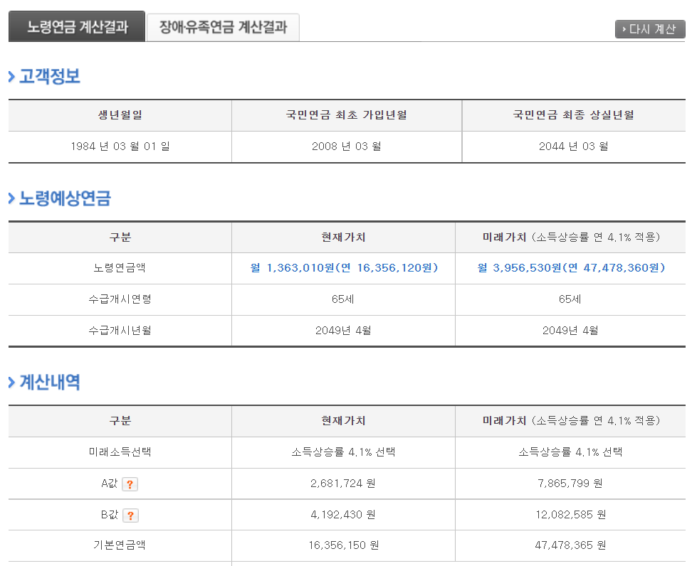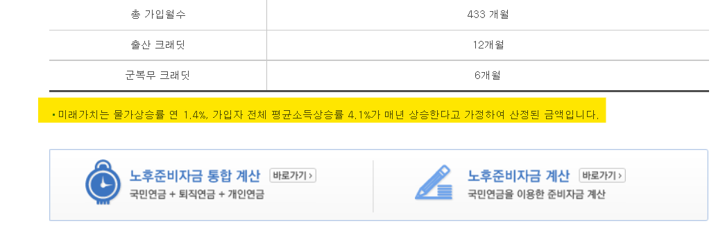여기서 나온 노령연금의 현재가치를 아까 두번째 단계였던 국민연금액에 직접 입력하고 다음으로 넘어갑니다.