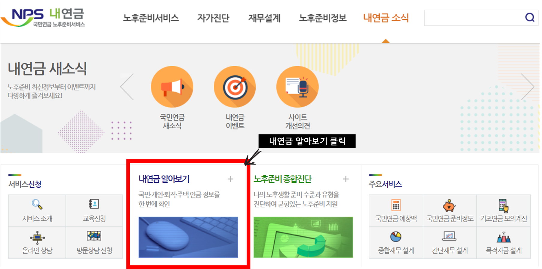 메인 페이지에서 '내연금 알아보기' 를 클릭합니다