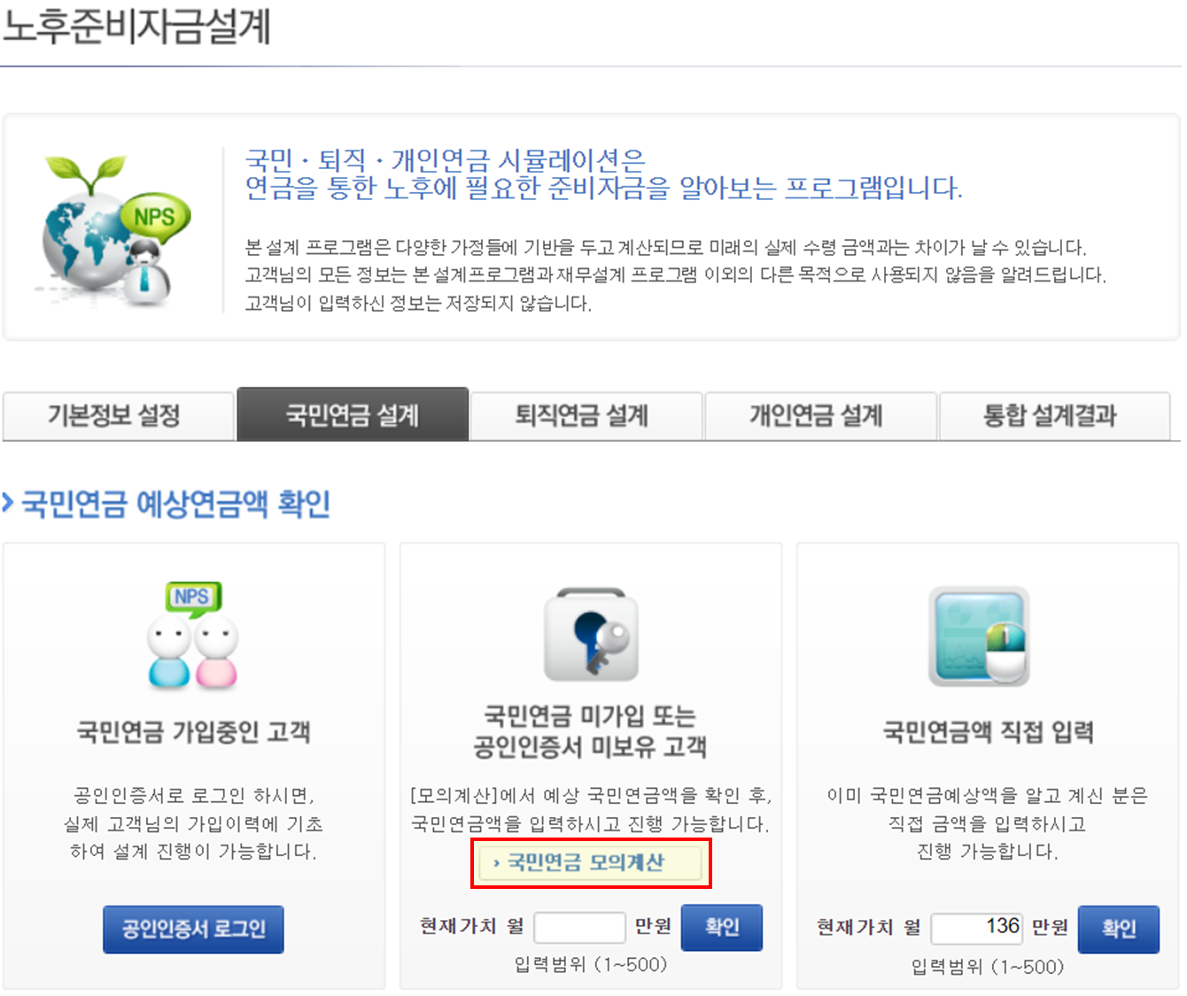 다음으로 넘어가 국민연금 모의계산을 클릭합니다