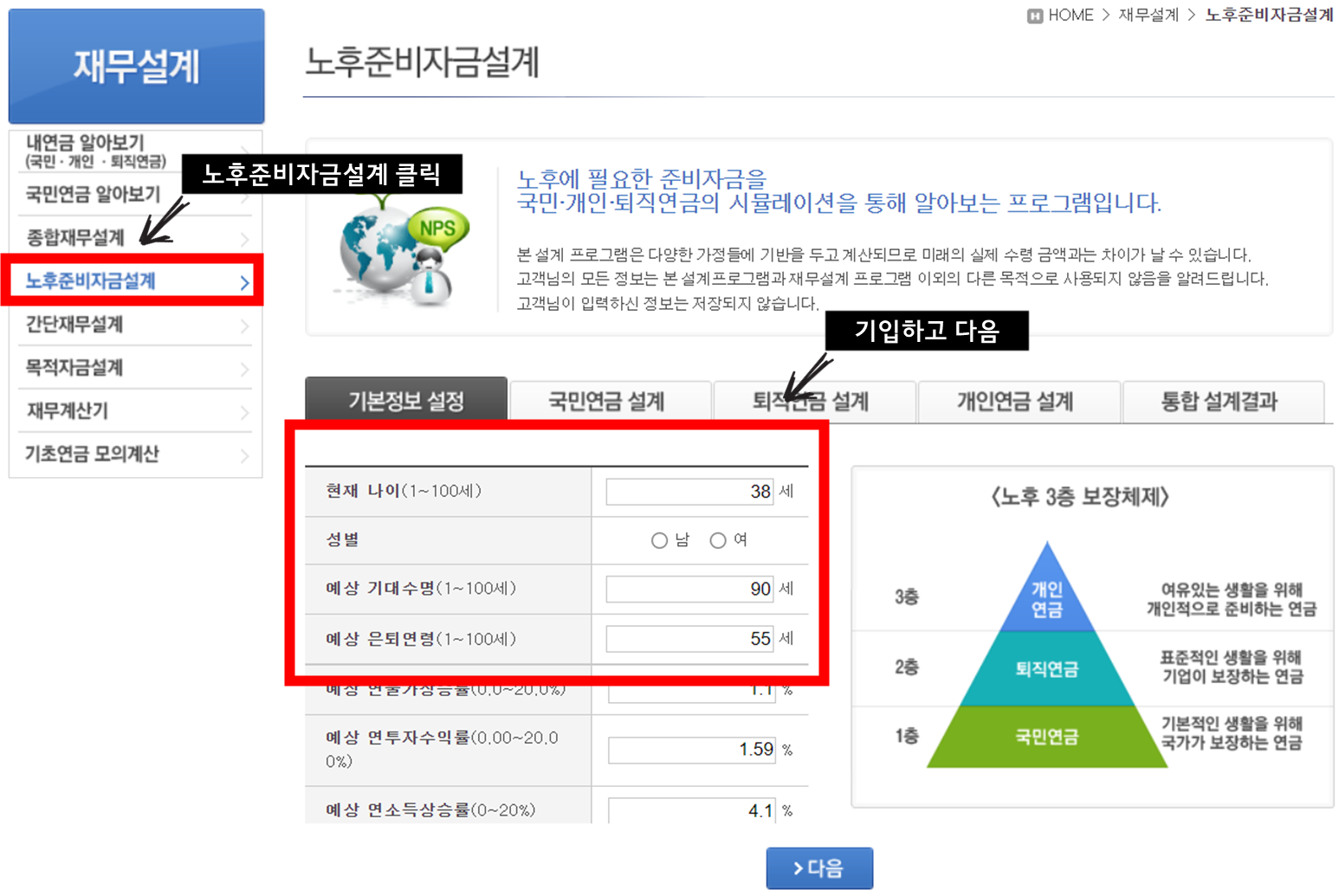 왼쪽 메뉴중 '노후준비자금설계'탭을 들어간 후, 기본정보를 기입하고 다음으로 넘어갑니다.