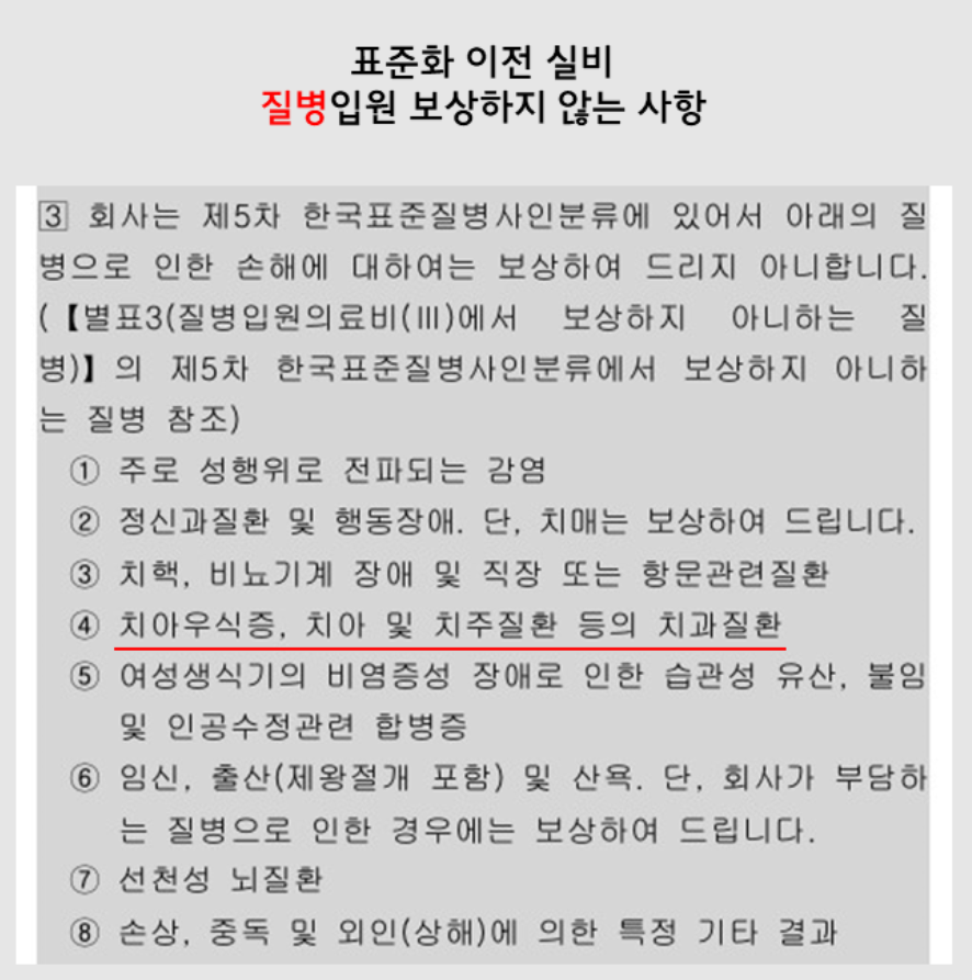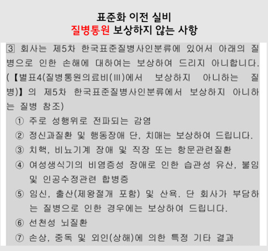 지금도 건강보험, 종신보험 등등 개인보험은 회사마다 약관이 다~ 달라서 약관에 따라 보상을 받을수도 있고 없을수도 있습니다. 하지만 이 표준화가 이뤄진 실손보험은 모든 보험사의 약관이 다 거의 똑같게 만들어 놨다는 거죠.