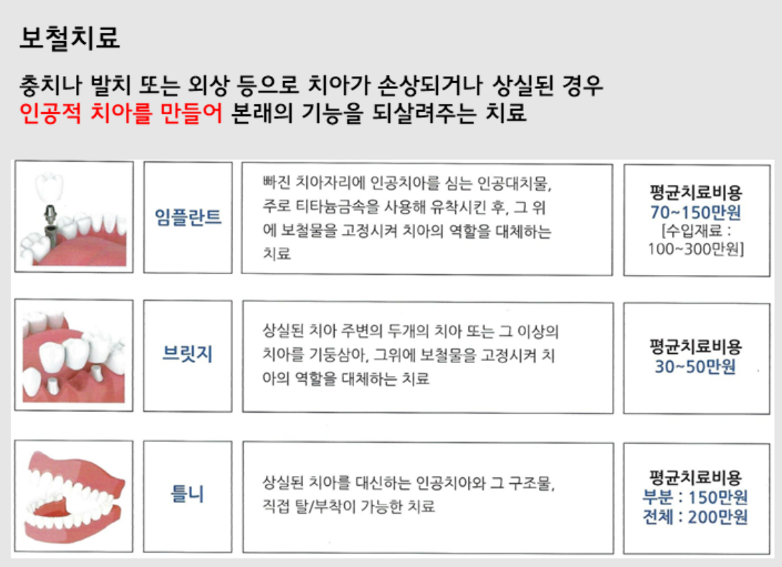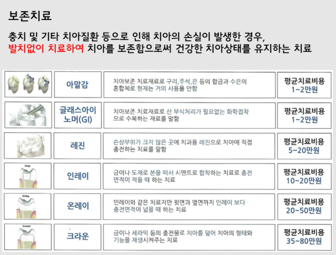 * [비급여]의 '인레이, 온레이, 레진' 같은 보존치료와 '틀니, 브릿지, 임플란트'등의 보철치료는 실비가 불가능합니다.