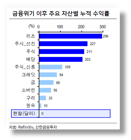 수익률 기준에서 현찰은 금융위기 이후 주요 자산들의 수익률을 크게 하회한 대표적 위험자산으로 평가됩니다.
