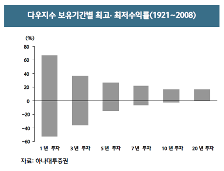 5년이 넘어갈 경우 +28%에서 -15% 사이, 10년 투자시 +19%에서 -1%.