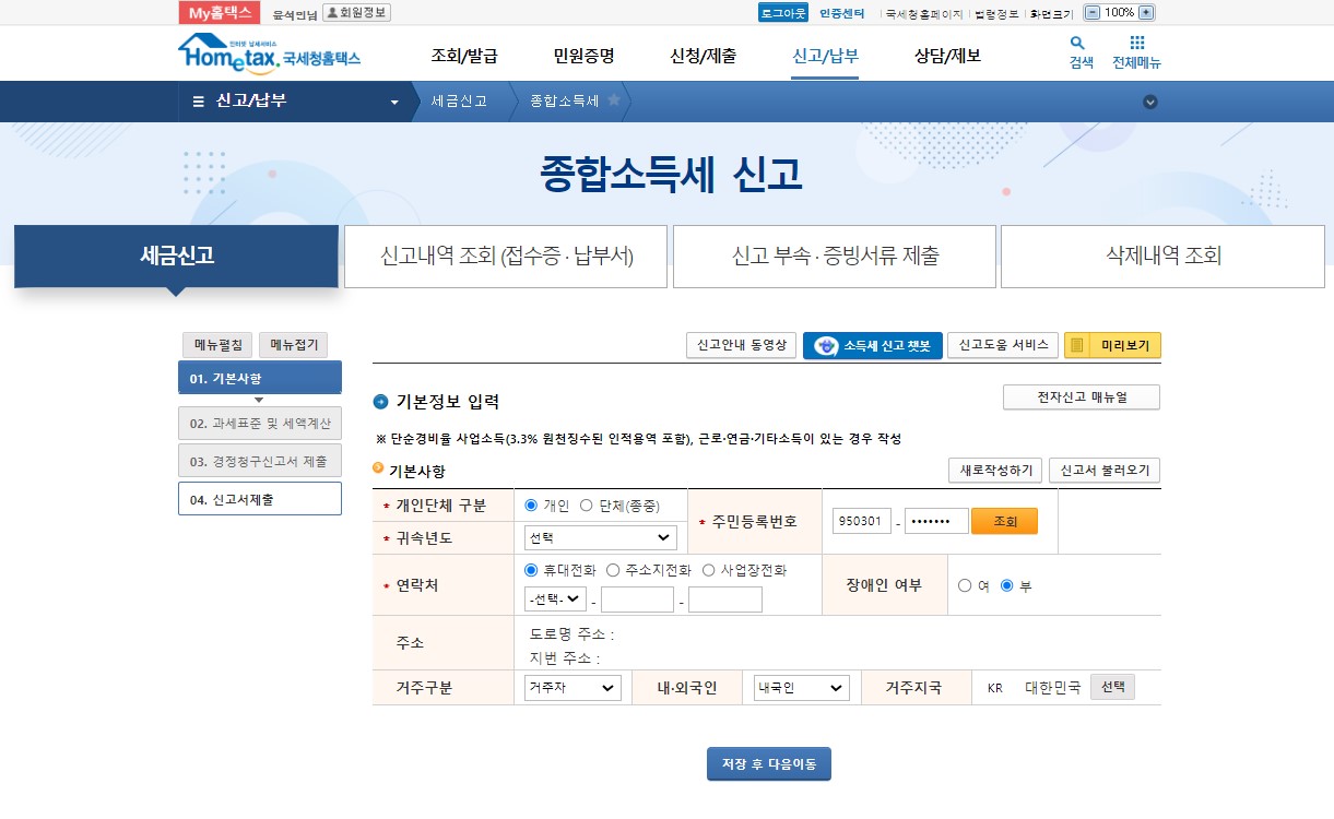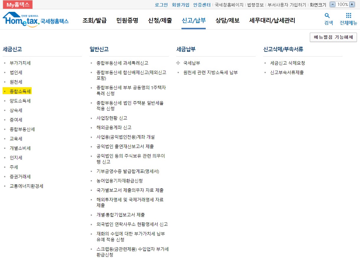 2. [신고/납부] -> [종합소득세]