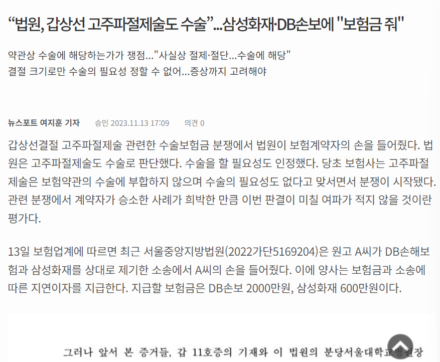 “법원, 갑상선 고주파절제술도 수술”...삼성화재·DB손보에 `보험금 줘` - 뷰어스