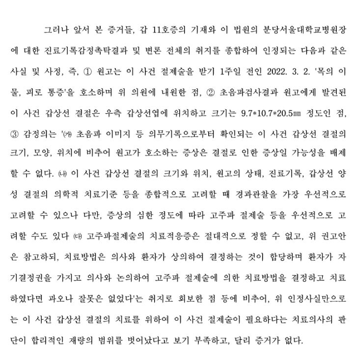 위 인정사실만으로는 이 사건 갑상선 결절의 치료를 위하여 이 사건 절제술이 필요하다는 치료의사의 판단이 합리적인 재량의 범위를 벗어났다고 보기 부족하고, 달리 증거가 없다. "