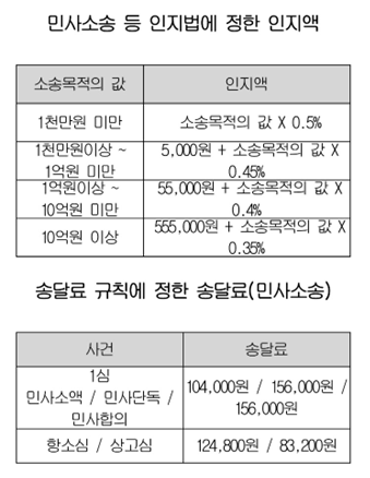 인지액과 송달료는 다음 표에 따라 지급됩니다.