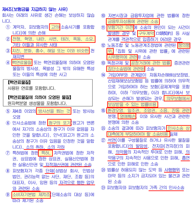 자세한 약관상의 면책 내용을 요약해서 나열해보면,