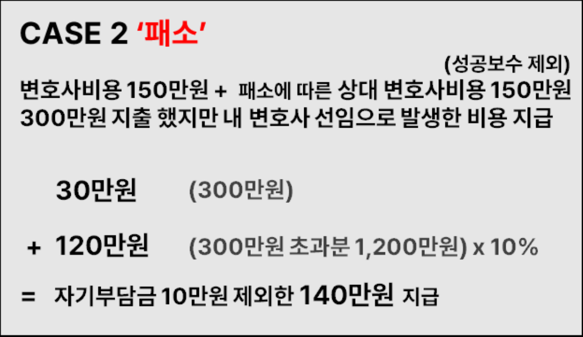 따라서 패소에 따른 상대방 법률비용 (성공보수는 제외됩니다) 포함 총 300만원의 지출이 발생하죠.