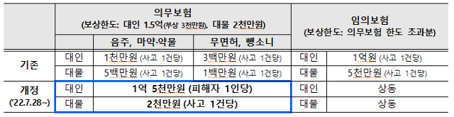 🆕️ 그래서 국토부는 의무보험 가입한도를 초과하는 부담금 한도 (임의보험 부분)는 사고 1건당 대인 1억, 대물 5천만원을 그대로 유지하면서, 의무보험 가입한도 이내의 부담금을 전액 부담하도록 개편했습니다. (22년 7월)