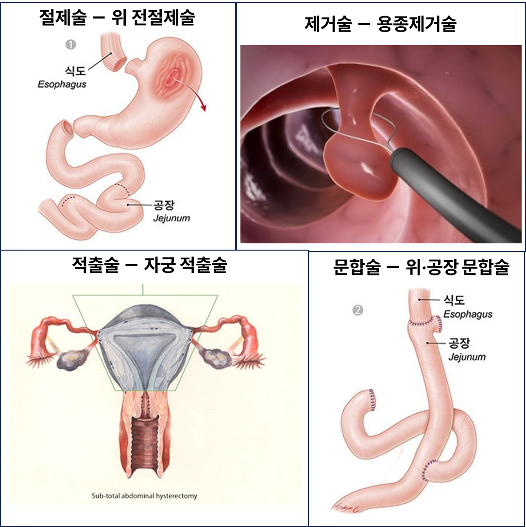 제거술 : 필요없는 부위를 없애버린다는 뜻의 절제술 ex) 위용종 제거술