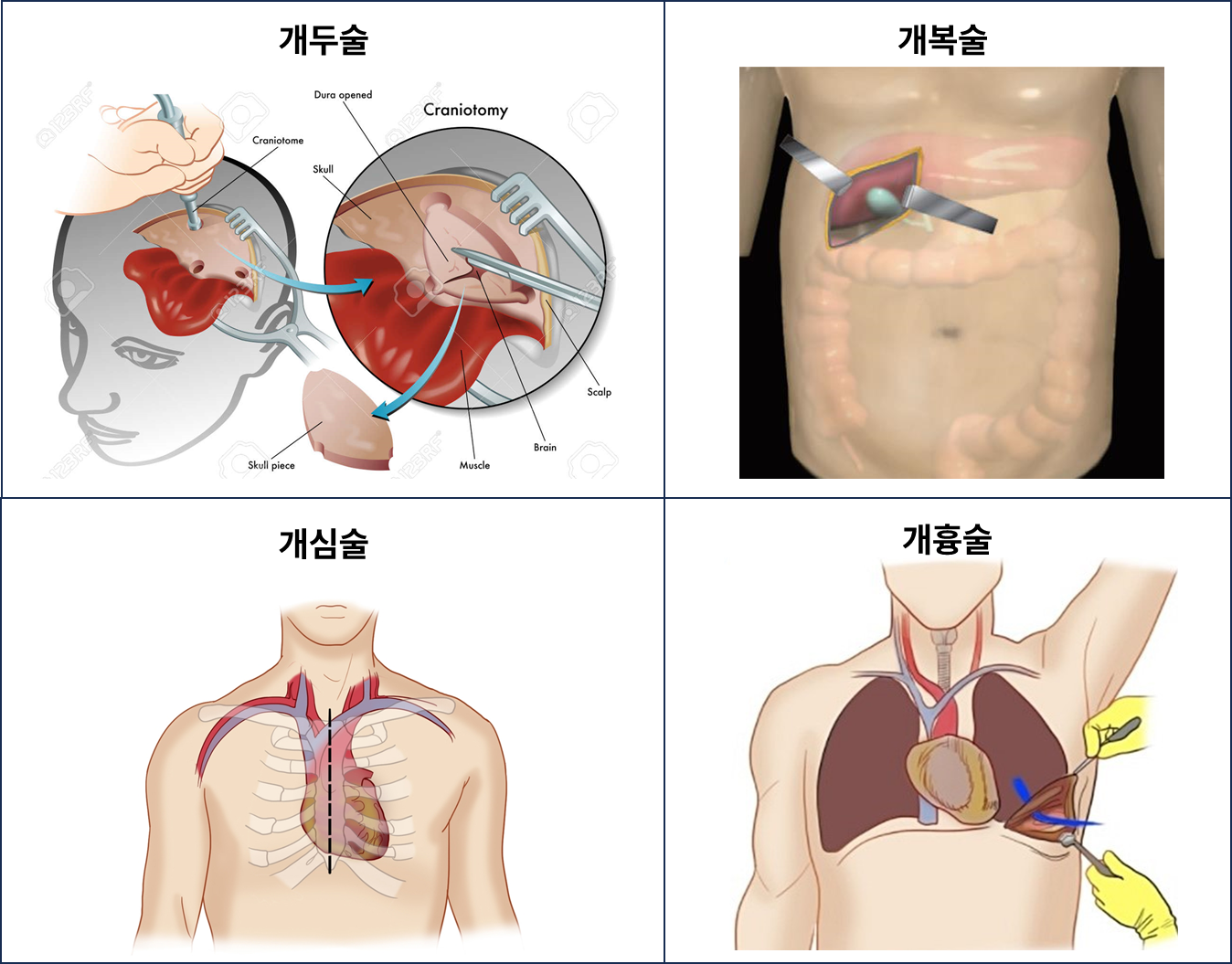 개복술 : 복부 장기등 복부내 병변의 치료를 위해 복부를 열고 하는 수술