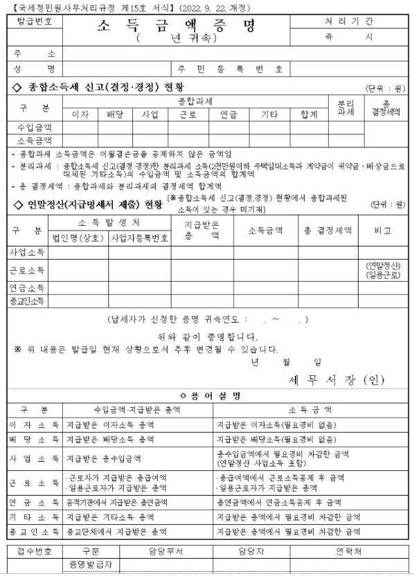 소득금액증명 발급 정보 신청방법, 처리기간, 수수료, 신청서, 구비서류, 신청자격 정보 제공 신청방법 인터넷, 방문, 민원우편, 모바일, 무인발급기 수수료 수수료 없음 신청서 국세 증명발급