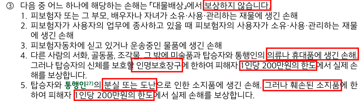 휴대품 (보상X) : 통상적으로 몸에 지니고 있는 물품으로, 객관적인 손해액 산정이 어렵고 도덕적인 위험의 방지가 어려운 물품.
