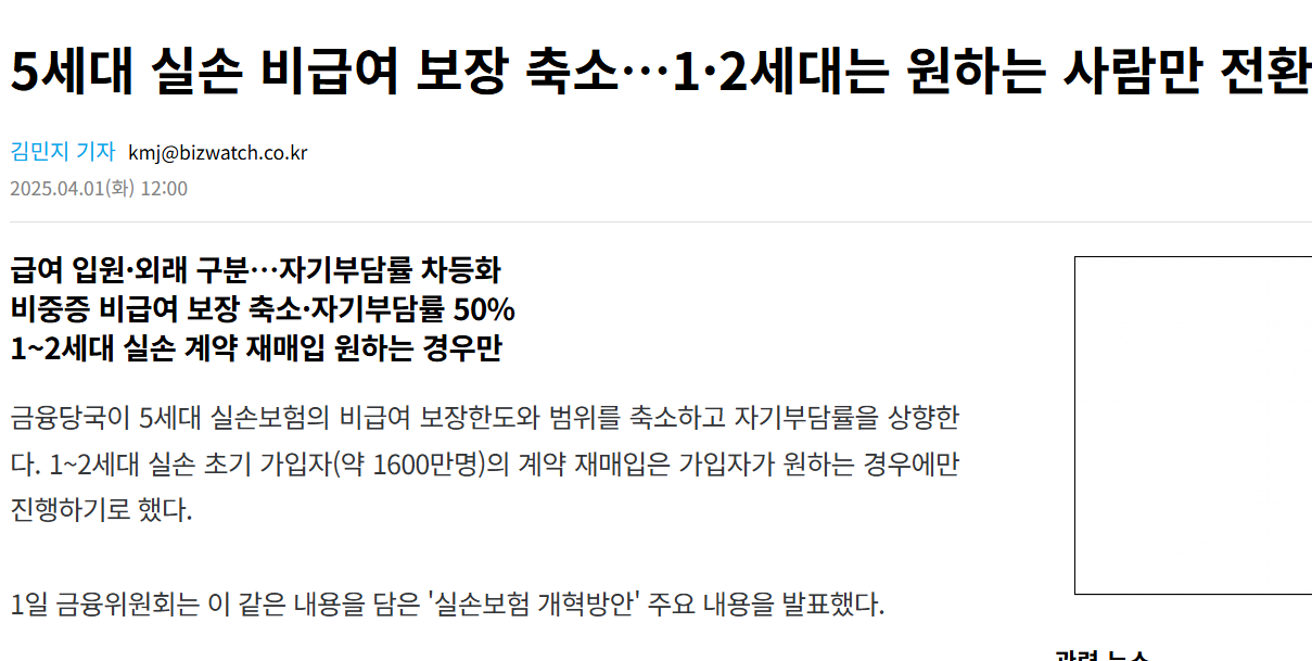 - 5세대 실손 비급여 보장 축소…1·2세대는 원하는 사람만 전환 – 비즈워치, 2025.04.01.