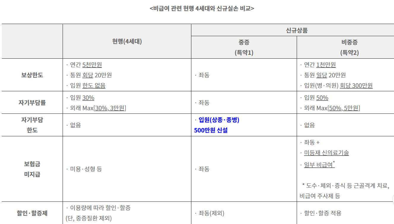 | 자기부담금 | 입원 無 / 통원 5천원 | 통원 1~2만원 | 비급여 30% | 급여 20% / 비급여 30% |