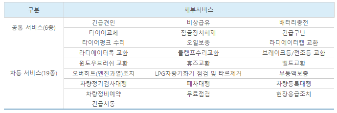 긴급견인, 비상급유, 배터리충전, 타이어교체,
