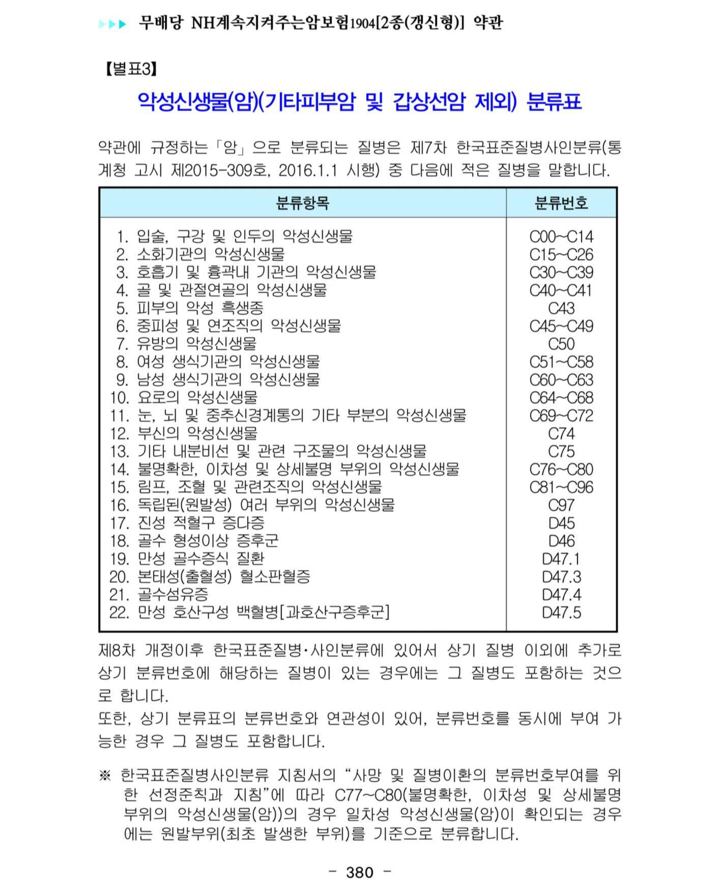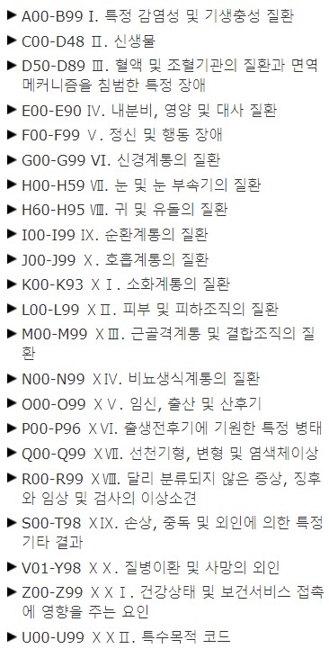 현재 판매되는 보험상품 약관의 KCD 분류표