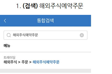 검색창에 '해외주식예약주문'을 입력하고 해당 메뉴를 들어갑니다.